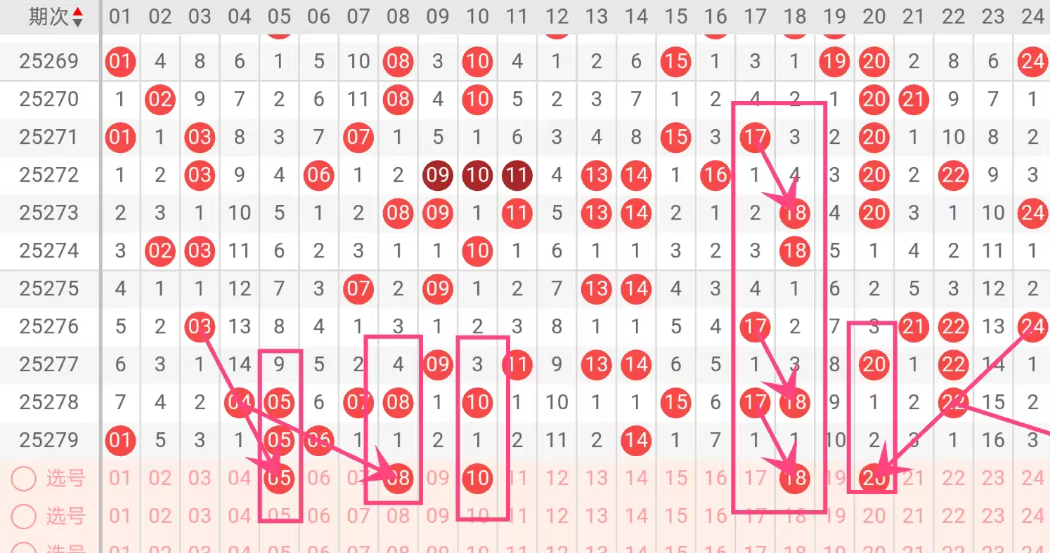 18:278 期出号(共 1 次),二区 “11 - 20 段” 新号温。278 期新出后休整一期,同段17(2 次出号)278 期续出,热势直接辐射至 18,形成 “17 带 18” 的段内联动,延续概率提升。