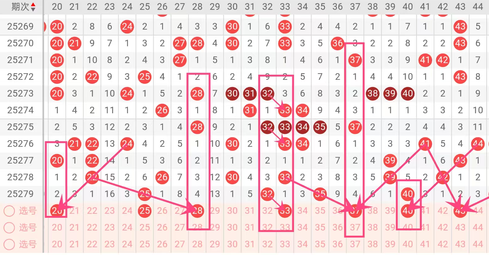 25:279 期出号(共 1 次),三区 “21 - 30 段” 新号温。279 期新出后无休整,同段26(278 期出号,共 1 次)278 期出号,22(276-278 期出号,共 3 次)为二区 / 三区交界核心热核(276-278 期连出),热势覆盖 “21 - 30 段”,25 借势延续概率提升。