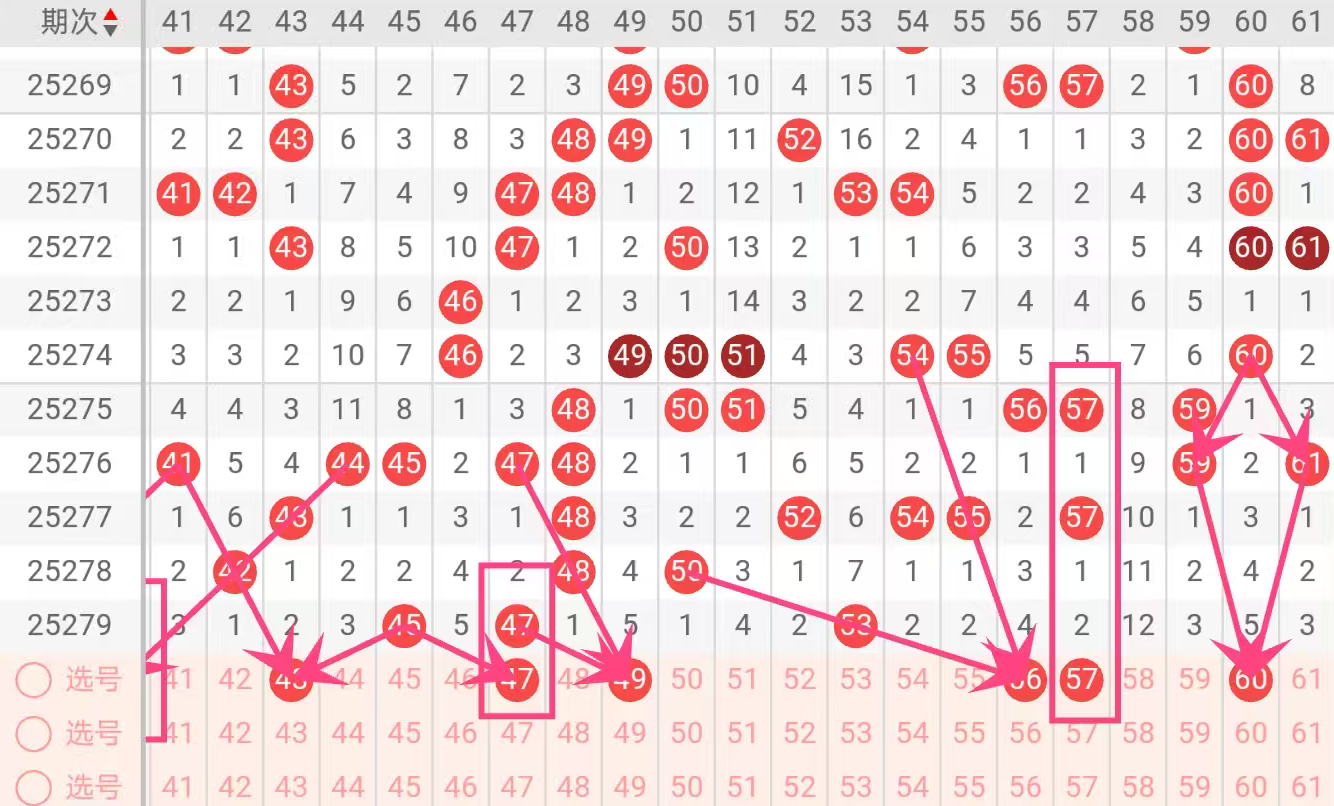 47:276、279 期出号(共 2 次),三区 “41 - 50 段” 热号。节奏呈 “出→休整 2 期→续出”,276 期出号后 277-278 期休整,279 期续出,未超 “准热号平均休整周期(2 期)”。同段45(276、279 期出号,共 2 次)同步出号,形成 “47+45” 双号同频活性,续热概率提升。