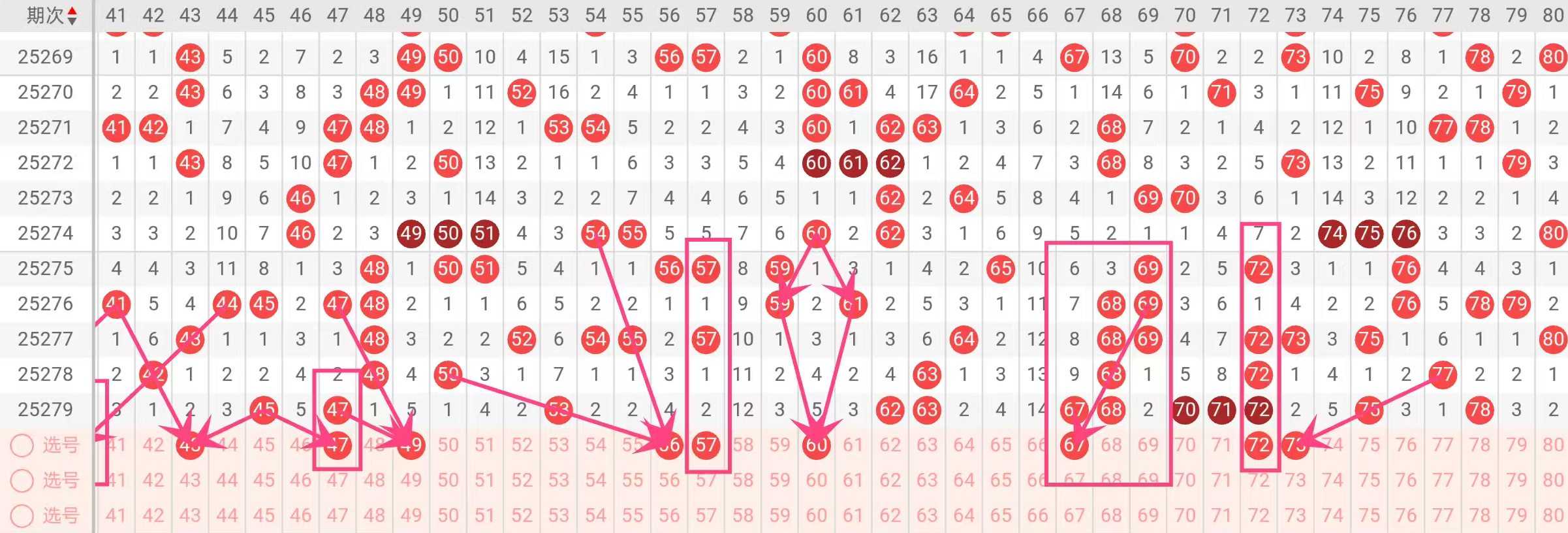 72:275、277、278、279 期出号(共 4 次),四区 “71 - 80 段” 核心热码。节奏呈 “出→休整 1 期→续出→续出→续出”,275 期出号后 276 期短休,277-279 期连续续出,“惯性续热 + 长连热” 特性拉满。同段73(277 期出号,共 1 次)、75(277 期出号,共 1 次)277 期与 72 同出,形成 “72 为核、多号联动” 的热段生态,续热概率提升。
