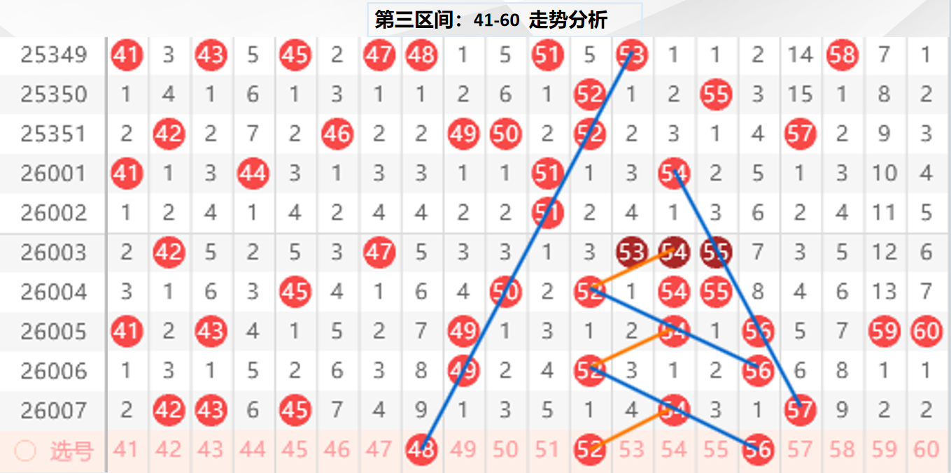 三区分析:【41-60】(走势图标注号码非小黄车大底,请谨慎参考,具体思路将在直播间分享讨论)
