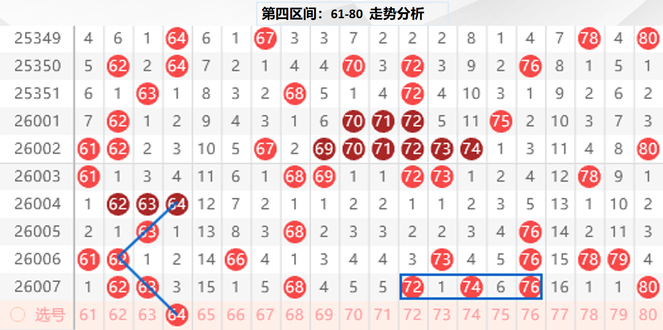 四区分析:【61-80】(走势图标注号码非小黄车大底,请谨慎参考,具体思路将在直播间分享讨论)