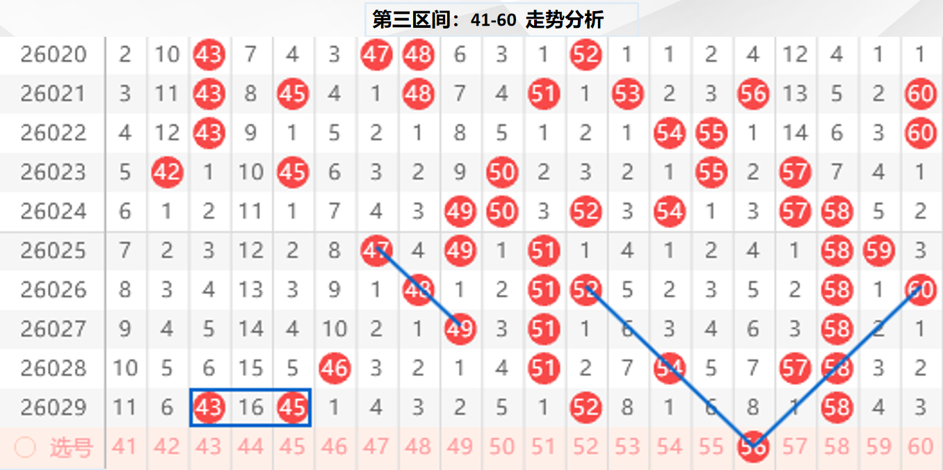三区分析:【41-60】(走势图标注号码非小黄车大底,请谨慎参考,具体思路将在直播间分享讨论)