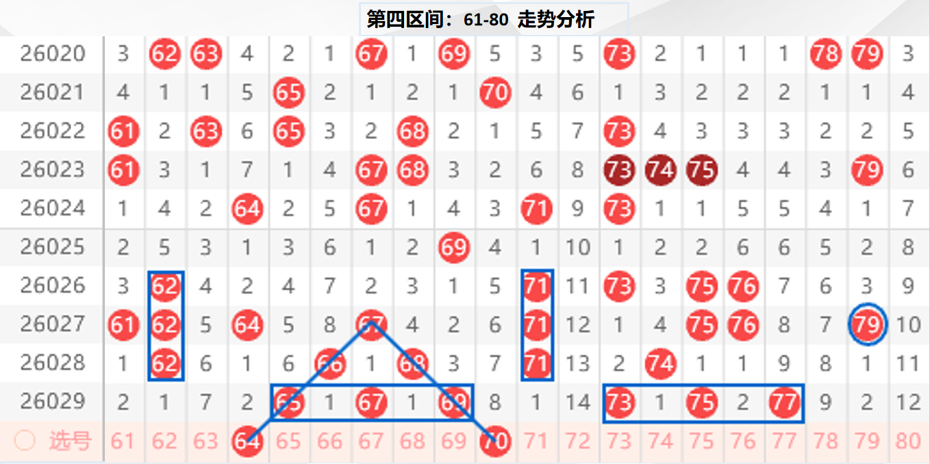 四区分析:【61-80】(走势图标注号码非小黄车大底,请谨慎参考,具体思路将在直播间分享讨论)