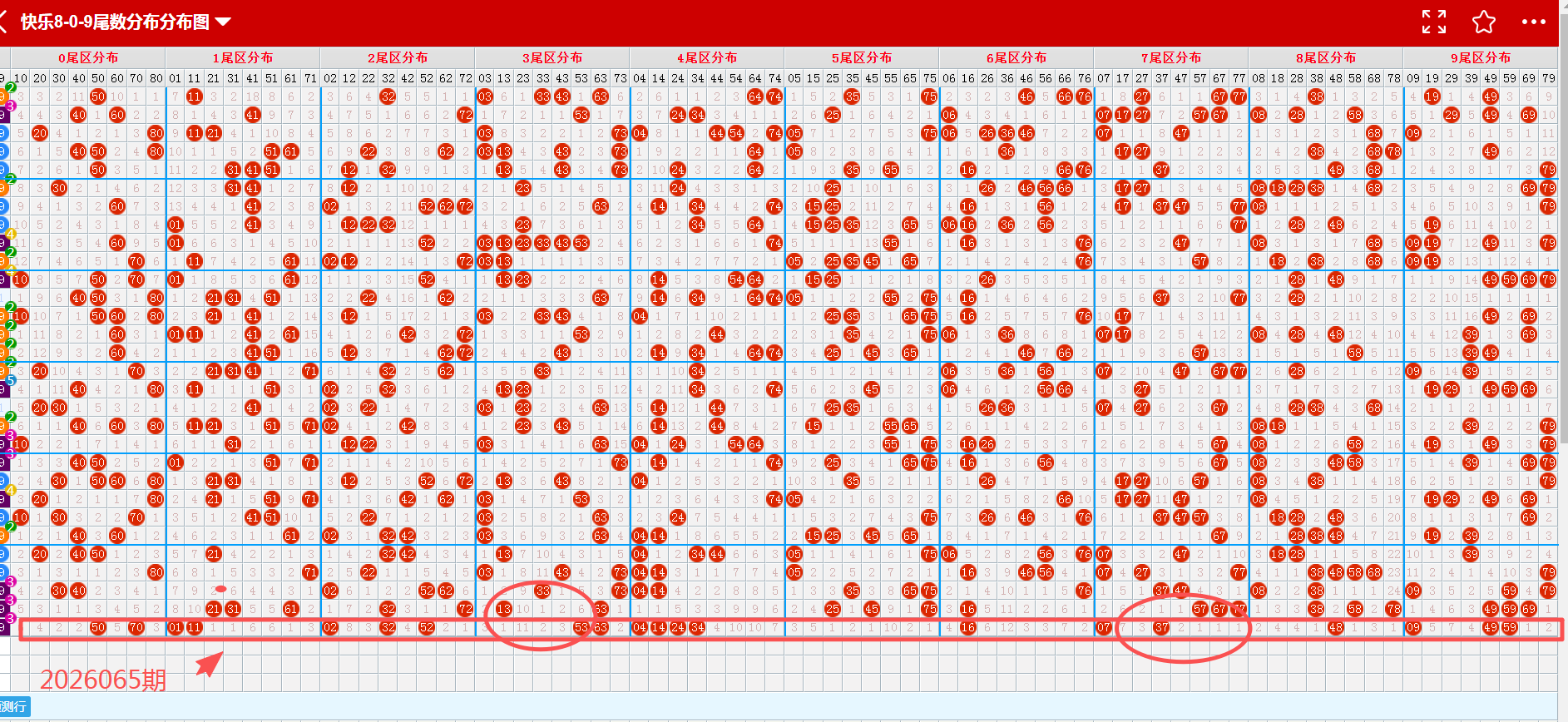 上图是快乐八2026065期的尾码走势图,从图中看0尾到9尾出号个数依次是:0尾号码区开出2个;1尾号码区开出2个;2尾号码区开出3个;3尾号码区开出2个;4尾号码区开出4个;5尾号码区开出0个;6尾号码区开出1个;7尾号码区开出2个;8尾号码区开出1个;9尾号码区开出3个;再看小尾号码(0尾-4尾)区有13码,大尾号码(5尾-9尾)有7码;数据比对统计后可以看到本期4尾出号数量最多,一共开出了4个中奖号码。本期5尾区出现断区!由走势比对推断2026066期重点需要关注3、7尾区号码下号热度回补和落号数量增加的概率较大。