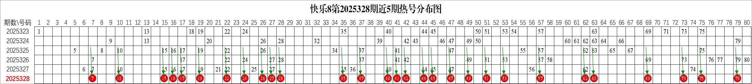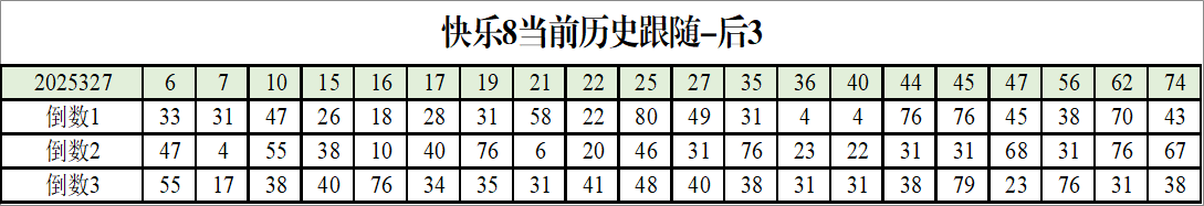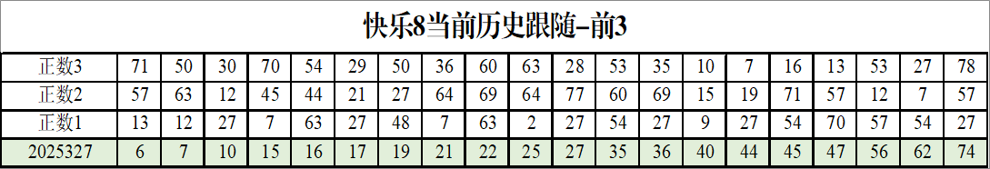 我感觉选热的同时,还要注意防冷条件开出,可以直接选取每个号码跟随出次前三的号码,也可以考虑把出次最后的三个数字加进去,不过这样可能号码太多,可以尝试。图上也能看出单独号码跟随的情况,我就不一一统计每个号码的出次了,我这里考虑提高概率,取每个号码历史跟随的前三号码和后三号码,根据2025327期的号码,我关注正数3和倒数3的号码号码为: