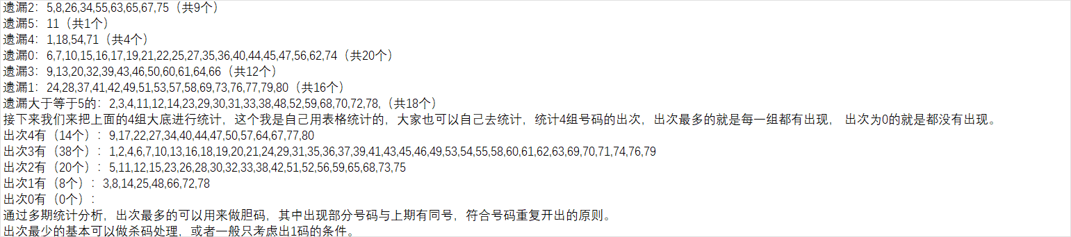 我的基本思路是通过号码尾数情况,取出6尾相关的号码作为第一组大底,然后统计号码跟随的情况分析出第二组大底,通过短期遗漏分析形成第三组大底,再按照对数补数分析统计出第四组大底(根据情况可能实时增加其他大底 ),最后把这些大底进行统计,重点关注出次最多的号码,搭配出次少的号码,灵活组号,形成本期精选胆码。