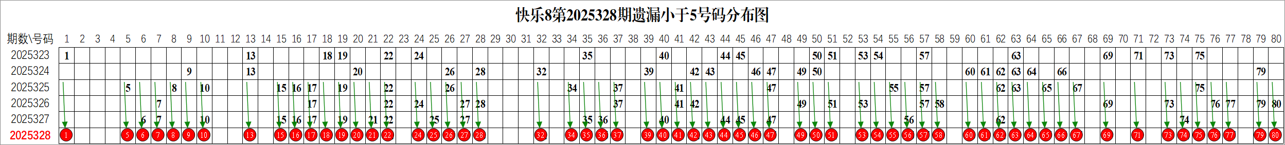 所以这个条件值得关注,从号码分布图上我们可以分析出,遗漏小于5期的号码有: