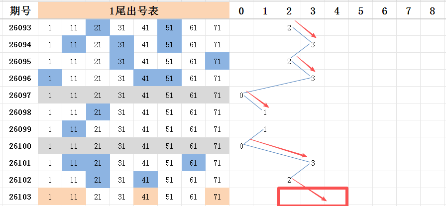 一尾上期开出两码走势,看好两个首码:号码01和号码11,能够开出其中一码或者两码全开。看好重号号码41的再次开出,尾码看好号码71的开出,走势不错。