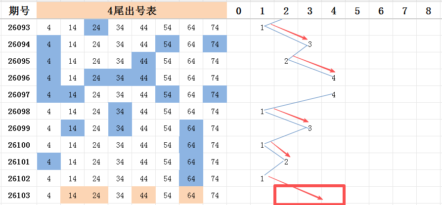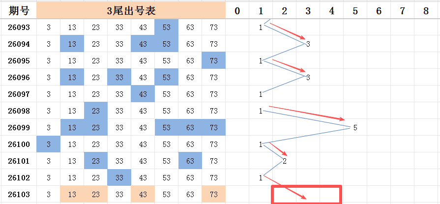 三尾上期开出一码走势,前半部分号码看好号码13和号码23的开出,分别是二区和三区的号码走势。后半部分号码看好号码43和号码73的开出,分别是五区和八区的号码走势。