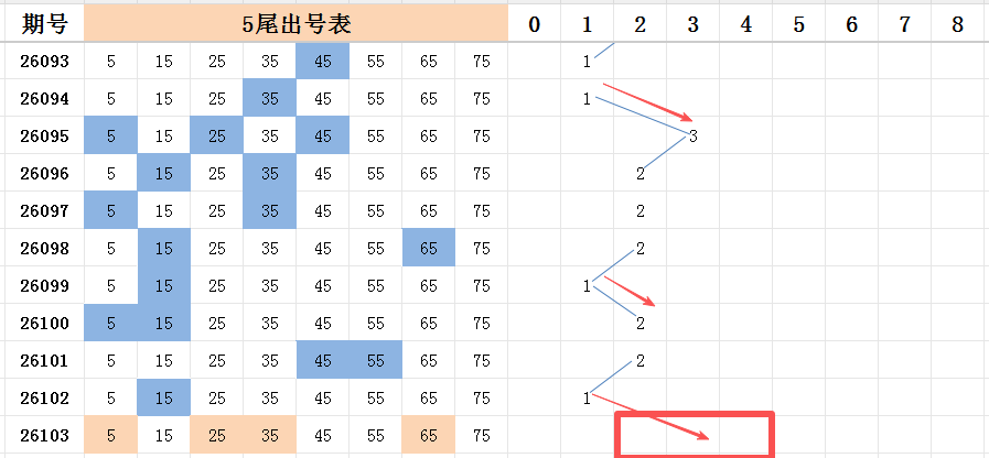 五尾上期开出一码走势,看好上期开出号码15的两个邻码:号码05和号码25,看好能够开出其中一码或者两码全开。号码35和号码65是前一期连号号码45.55的两个斜码,走势上比较不错,可以选一下。