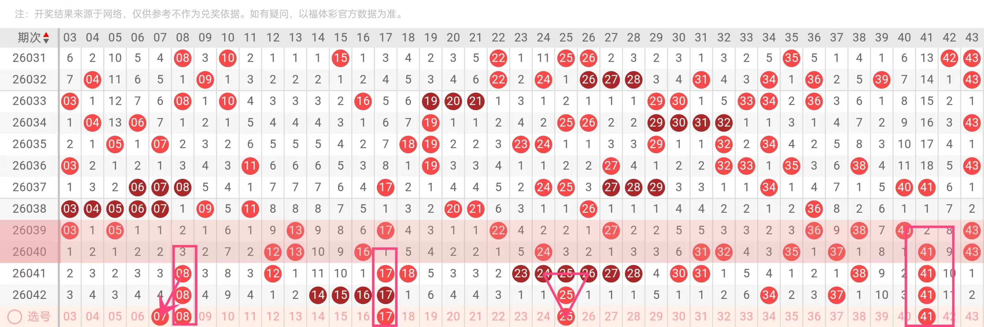 理由:冷号反弹临界。41在近10期内仅出现3次,近5期有2次(042、040),呈现缓慢升温态势。此前遗漏值曾达6期,目前已进入反弹通道,属冷后回温型胆码。