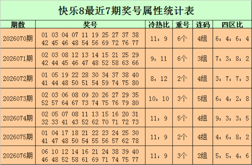 福彩快乐82026076期开奖回顾:06 10 12 14 16 21 24 38 39 40 46 48 52 58 61 69 71 74 75 77,其中奖号冷热比为119,开出3个重号:212448,四区比为5546