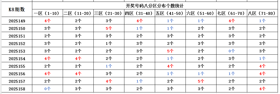 如图,红色字体是热号区,区间开出4个及以上号码。蓝色字体是冷号区,区间开出1个及以下号码。以近10期为一个分析周期,依据久热必冷,久冷必热的规律,本期重点关注:二区、八区,区间可能开出3-4个号码。一区、四区、七区,区间可能开出1-2个号码。个人分析,仅供参考。