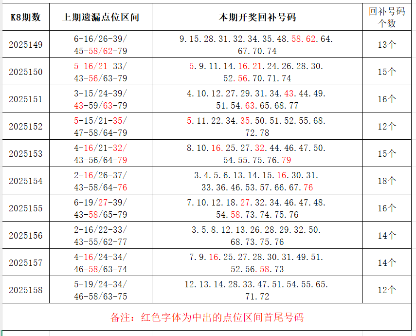 如图,上期的遗漏号码在下期开出10个左右,即为回补号码。定准点位区间首尾号码是关键!以上期2025158期(会员专区数据)为例,定位4个遗漏区间,围中12码!结合上期开奖号码,以跨度值大于或等于7为依据,本期关注4个遗漏区间:1-12/14-22/55-62/72-79;重点关注遗漏-区间:****(会员专区可见),区间遗漏号码可能在本期回补开出。注意区分遗漏区间回补号码和大底号码,不要混淆。个人分析,仅供参考。