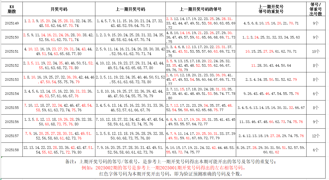 特别提示:有虹友留言,关于邻号和邻重号的数据统计,在此再次赘述:邻号,是指上期开奖号码的左右相邻号码;其中重复出现的邻号,即为邻重号。一定要区分,邻重号不是上期开奖号码的重号,是邻号里的重号。可能新关注的粉丝,还不适应这种统计方法。熟能生巧,无它。统计方法不同,得到的数据结果不同。个人分析,仅供参考。