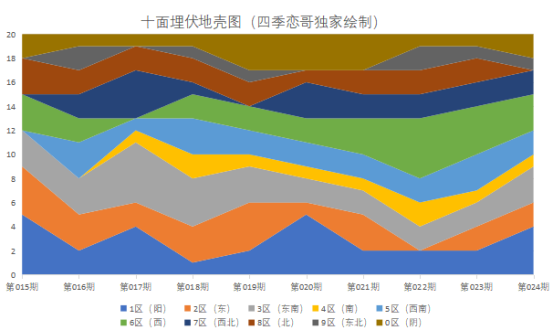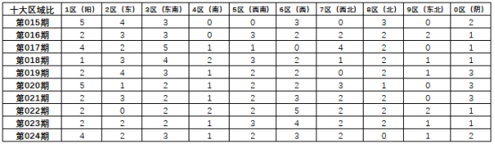 上图根据每期出号数量绘制而成地壳图,或者你看成波浪也行,由图显示,上期这里提示1区还是不错,本期根据图示趋势要注意哪个区可以自己研究,今日6区还是不错的。