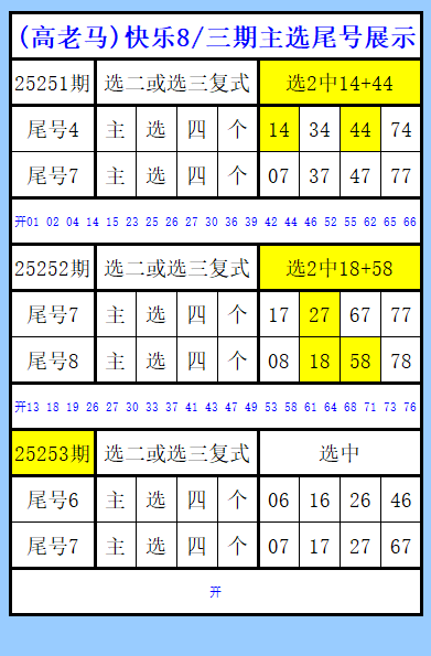 快乐8第253期图文(高老马),主攻尾号展示,上期中主二18+58