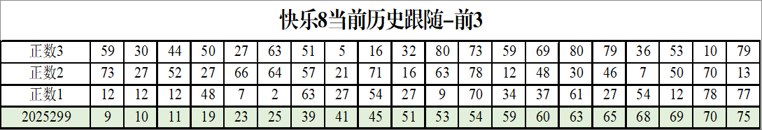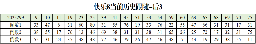 我感觉选热的同时,还要注意防冷条件开出,可以直接选取每个号码跟随出次前三的号码,也可以考虑把出次最后的三个数字加进去,不过这样可能号码太多,可以尝试。图上也能看出单独号码跟随的情况,我就不一一统计每个号码的出次了,我这里考虑提高概率,取每个号码历史跟随的前三号码和后三号码,根据2025299期的号码,我关注正数3和倒数3的号码号码为: