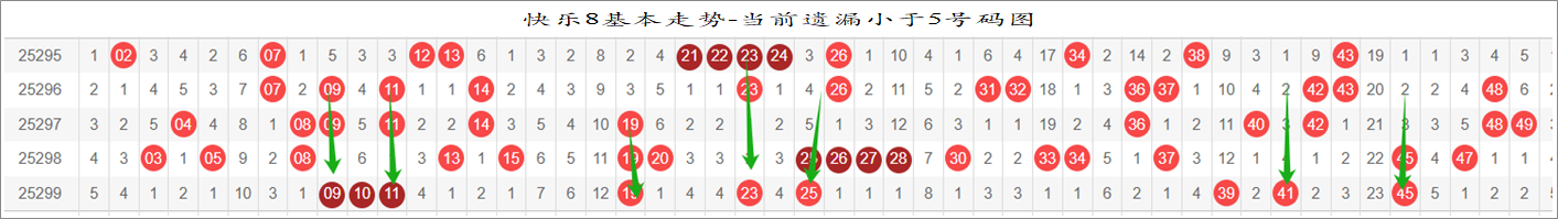 所以这个条件值得关注,从号码分布图上我们可以分析出,遗漏小于5期的号码有: