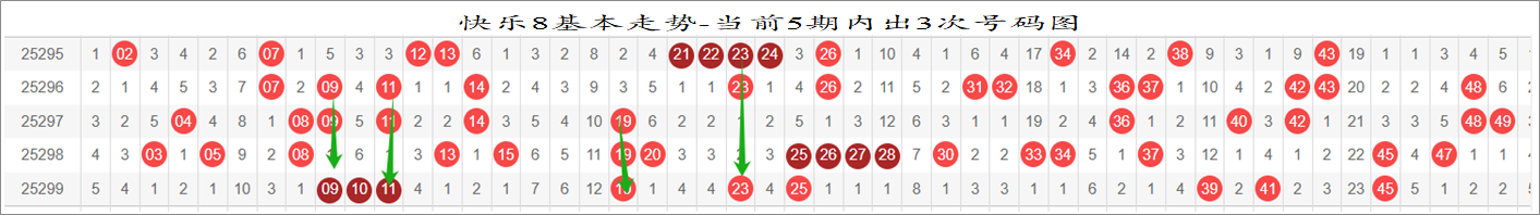 这个条件可以理解为追热号,主要是选取遗漏小于5期的号码来做大底,通过号码分布图我们也能看出,每期都有重复号,都有上期号码的相邻号,再仔细观察下面的部分分布图,2025299期,按照【号码(遗漏)】的方式统计出来是:9(1),10(6),11(1),19(0),23(2),25(0),39(12),........。可以看出遗漏小于5的号码比较常见,这就是一个大概率事件,我们就可以用这个梳理出一部分号码,用来作为我们交集的一组号码。