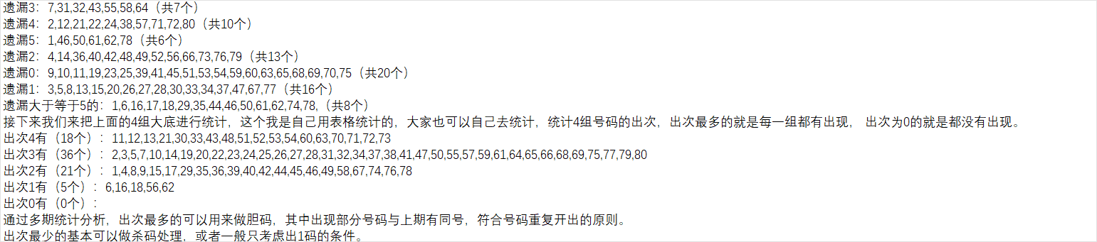 如果把对数和补数合起来有40个号码,中间可能还会产生一下重复数,通过近几期的统计分析,以上期数据进行补数对数计算推算下一期的概率不高。为提高概率,我主要是用前两期的数据来进行对数补数推算,然后再组成一个集合,作为我的第四组大底号码。