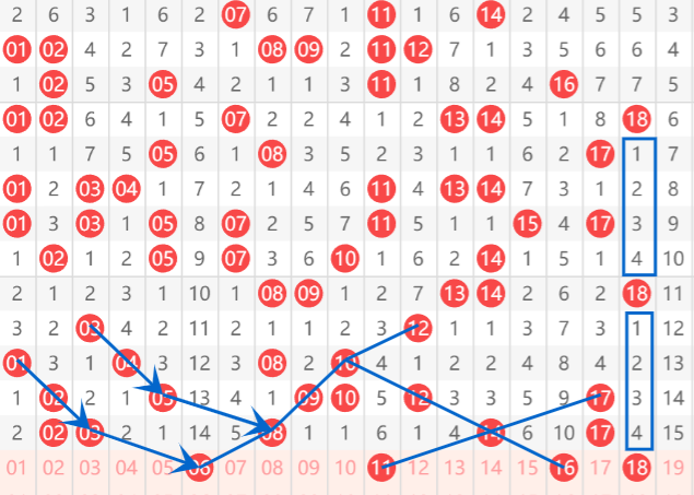 快乐8第093期01-20区域,推荐第一个号码是06号,大家看到上面是03.04和05,间隔两期,给了个08,那么01.02.03走了相同的走势,间隔两期给个06是同样的走势,同时我们看到12间隔一给了10.09.08的斜三连,再间隔一给个06,形成一个吊角对称;下来就是11号,我们可以看到07斜着间隔两期给14,再间隔两期给11的走势,然后16号可以看到是一个间隔一的四斜连,然后就是18号上下对称。