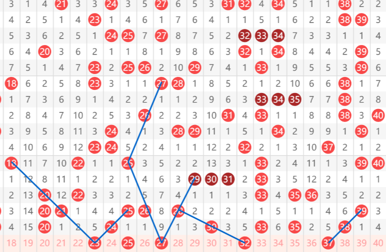 快乐8第093期20~40区域,推荐的第一个号码23号,可以看到18间隔一给了20,然后21。再间隔一给23的一个吊觉对称走势,还有25,24斜着开23的三斜帘走势。然后就是25号、27这两个号码。27,我们看25向上间隔2给了26,再间隔一给27,那么上下应该是同样的走势下来,32号是28间隔一给30,再间隔一给32。32从中间那个32看的话,向上间隔一起给31,然后间隔3期回到了32,下面的走势是完全相同的,然后就是37期三斜连。