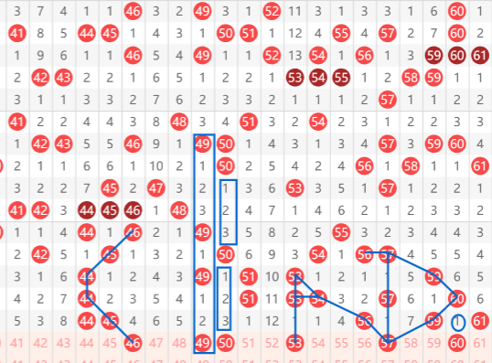 快乐8第093期41-60区域:推荐的第一个号码46号。我们可以看到44向上给出45带出46向下很有可能也同样给出46,这个地方是一个往回筐的走势,昨天给大家推荐的45开出,那么46给我很可能继续开,下面就是49,我们可以看到一个间隔3,间隔一间隔2的走势。然后还有50一个间隔3的对称走势。下面就是53号一个戴帽走势,57号上下对称的间隔一走势,以及我们可以看到53斜着开出54,然后间隔一给出56,然后再出57的走势,从右边看60向上给59,间隔一给57,那么向下已经给出了59。间隔一再给出57,形成一个对称走势。最后就是60这个梅花号推荐开出。