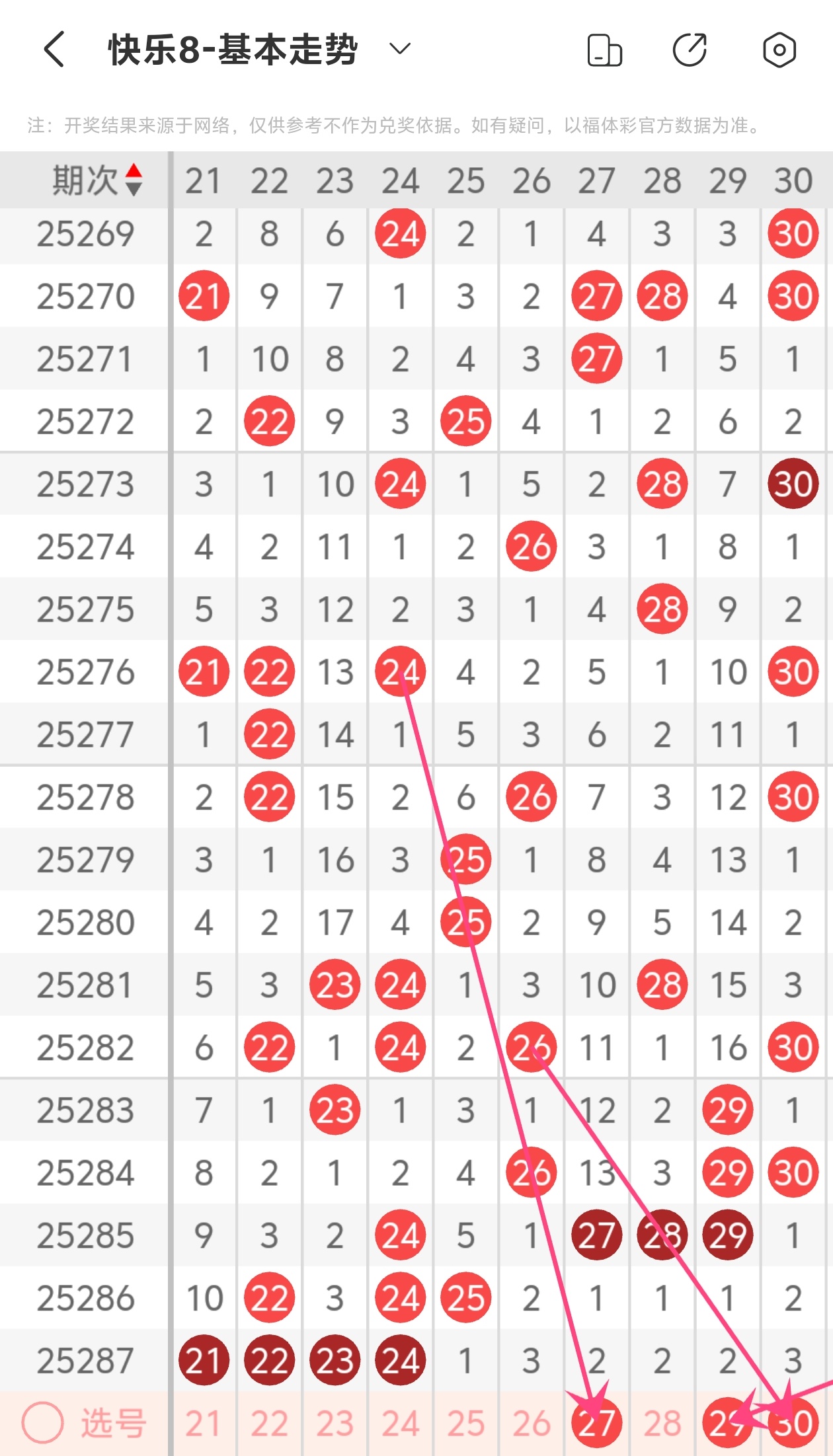 上期第三区间开出21 22 23 24,本期我们可以从上面走势图中看到选号的思路,本期推荐27 29 30