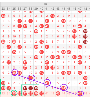 三区胆尾8尾7尾,上期边号回补,本期重点关注边号34 35 36 37 38 39 40 43 45出二码,形态上35 是三斜连形态上图已勾画,其次关注热尾37 47 38 48,如果不看好37 可以试试同尾号47,47形态是5斜上图已勾画,重号上期3开头本期看热尾34 37 38三出一,本期关注四码34 37 47 48