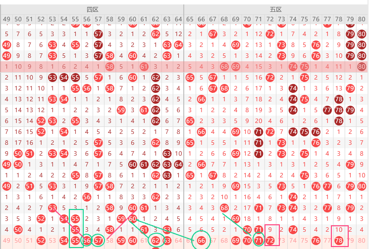 四区胆尾2尾5尾,四区5尾走热预判出三直落看好55,隔一期号没断本期52 54 59 60符合四出一,边号接着看49 54 56 57 59 60 62 64要出1-2码,62形态上是三斜连上图已经勾画,不喜欢62试试52,其次56 57形态特别好看是四斜连,上图已勾画,本期关注五码52 54 55 59 62