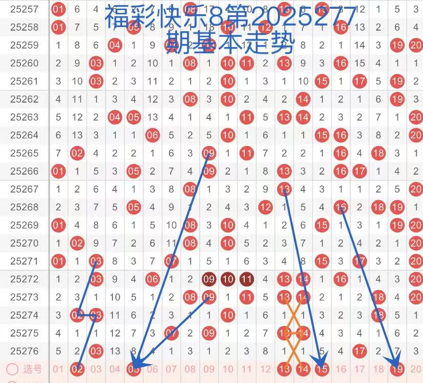 下面是我对2025277期福彩快乐8的分析和预判,希望通过我的分析能让大家今晚大满贯!福彩快乐8上期开奖号码如下图