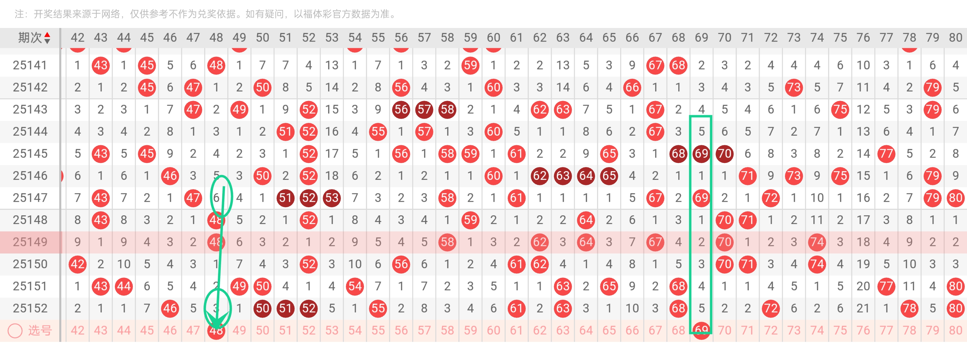 - 跨度控制价值:69属70以下最大号,可大幅压缩组合跨度(05→69跨度为64,低于均值68)。历史数据显示,跨度≤65的组合中头奖概率提升23%。