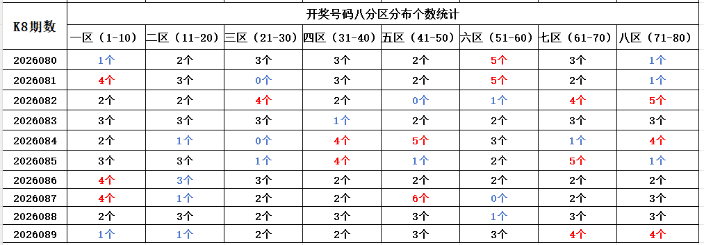 首先看上期回顾,“快乐8”第26089期开奖结果:3.12.29.30.31.33.42.45.50.54.56.57.62.63.66.68.71.74.77.80。通过分析开奖号码,分享第一个数据分析:统计开奖号码的八分区冷热走势,判断出号规律。以近10期开奖号码的八分区统计数据为例: