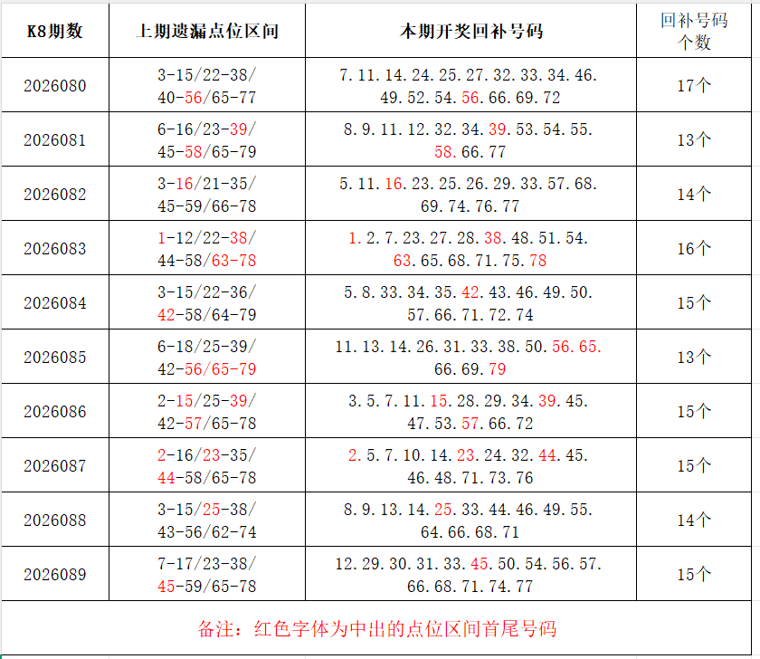 如图,上期的遗漏号码在下期开出10个左右,即为回补号码。定准点位区间首尾号码是关键!以上期2026089期为例,定位4个遗漏区间,围中15码!结合上期开奖号码,以跨度值大于或等于7为依据,本期关注3个遗漏区间:3-12/12-29/33-42;重点关注遗漏区间:2-15/23-36/44-55/67-78。点位区间号码和大底号码请勿混淆,个人分析,仅供参考。