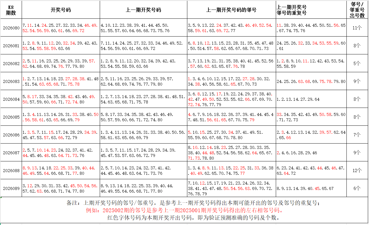 如图,红色字体是上期邻号、邻重号在下期开出,每期开出10个左右。上期邻号开出5个,邻重号开出1个本期参考邻号:2.4.11.13.28.31.34.41.43.44.46.49.51.53.58.61.64.65.69.70.72.73.75.76.78.79邻重号:29.30.31.32.55.56.57.62.63.67;个人分析,仅供参考。