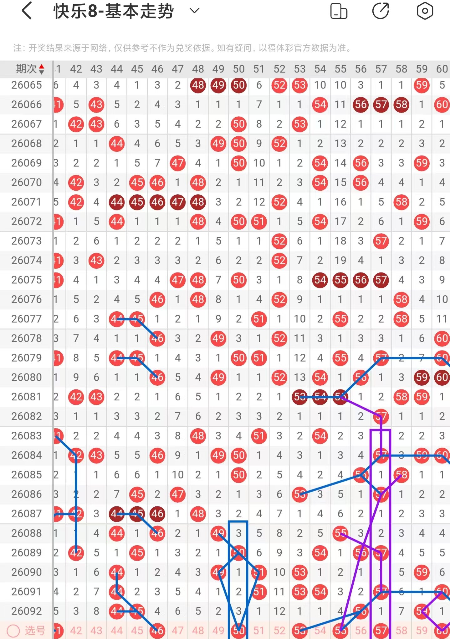 三区间上期小面积减少落号,一共开出四个号码球,本期考虑等同数量的号码球,以42号码球为对称走势起点,注意走势形态的41号码球,注意近期38、44、45号码球同期下落,下期回补46号码球,注意百期相似形态的50号码球,注意隔期对称回补的57号码球,注意近期56、57、60号码球的走势相似,本期注意53号码球,注意近期0、1、2期走势的55号码球,以63号码球为对称走势起点,注意走势形态的60号码球,同时也是梅花形态号码球,因此三区间关注46-50-53-55-57,注意本区间的选二复式46-50-55。