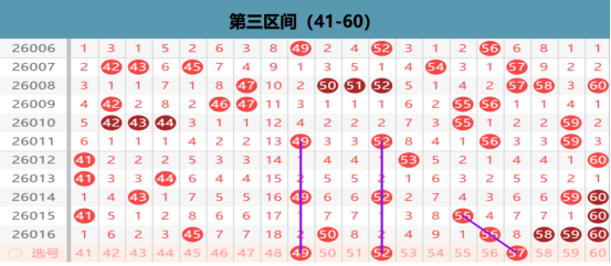 本区上期开出6码的,那么在本期我们优先考虑的就是45 50的同形态的出号,在50 60的位置上我们要考虑同尾的出号点位,在49 45和50 56的位置上我们要考虑的就是分边的出号点位,这个位置上我们是要考虑容错的出号点位的,在很多的位置上就是只有一码的出号机会的,那么在空位上我们优先关注的就是小周期的出号点位,41 43 52 53的位置上我们要考虑做择一的出号的可能性,在空位温冷的位置上我们也是要做择一的出号,那么其他位置的出号就不是我们考虑的重点位置了。