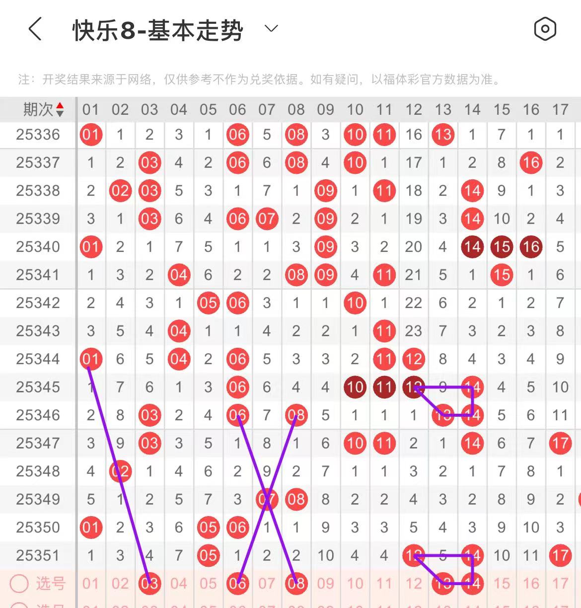 01-10区:本区间上期开出了一个号码,从号码走势图上看,该区现属于温号区,出号个数在两个号码左右,有出号走势的号码有03号,斜连出号走势,06.08号,交叉斜连出号走势。