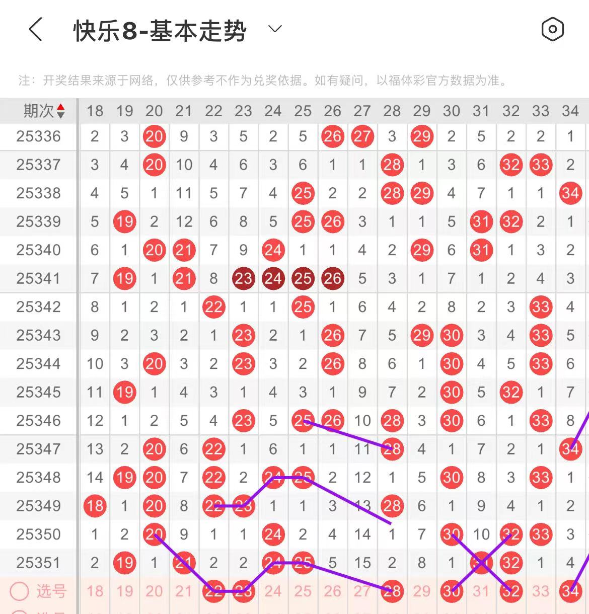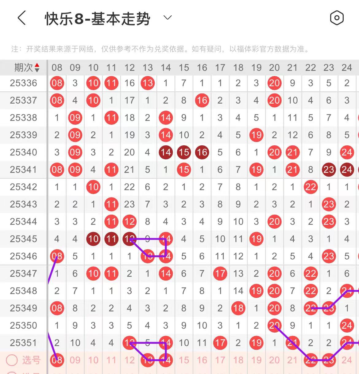 11-20区:本区间上期开出了四个号码,从号码走势图上看,上期出号个数突增,本期注意出号个数减少至两个号码左右,有出号走势的号码有13.14号,同出,复制上面走势形态出号。