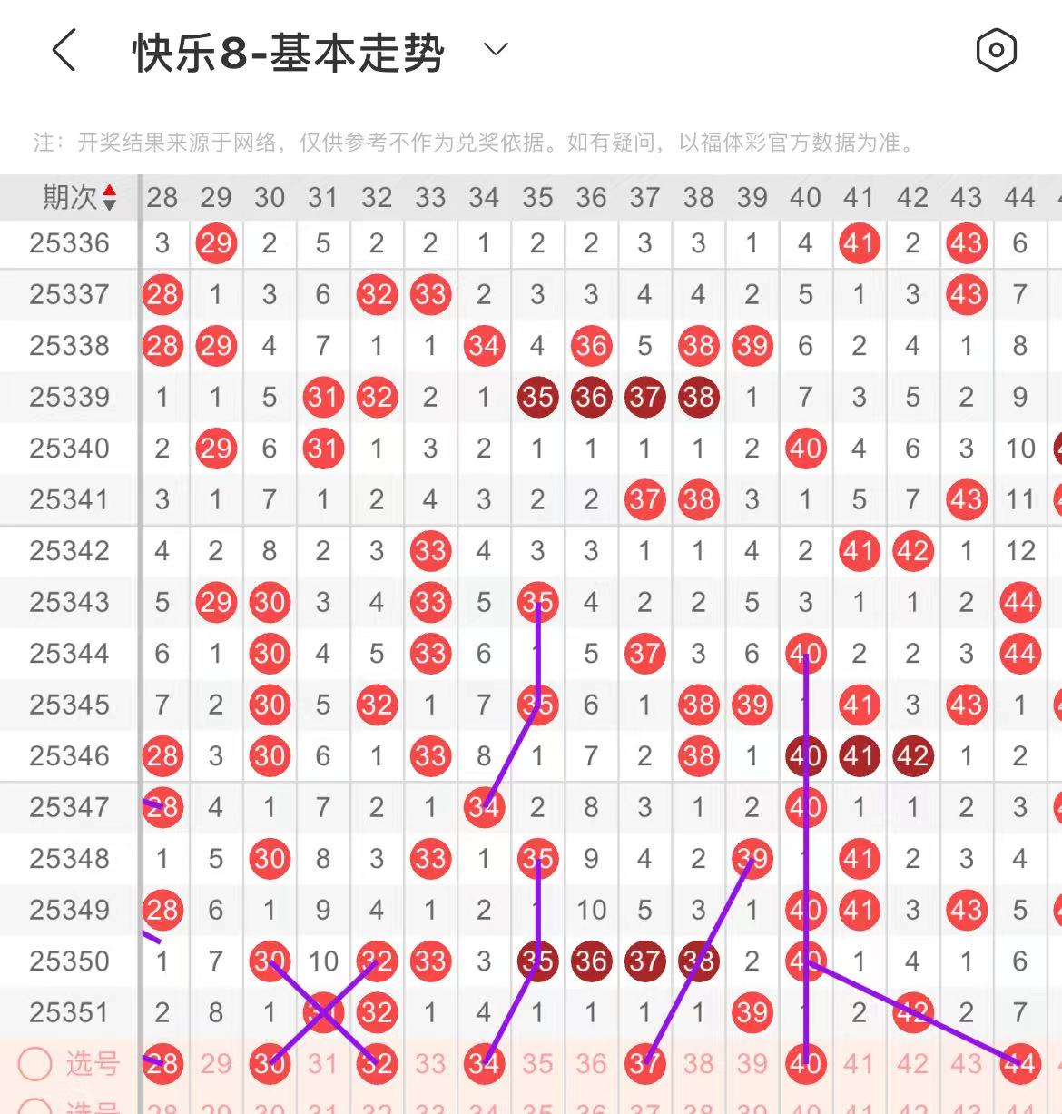 31-40区:本区间上期开出了三个号码,从号码走势图上看,该区现属于回补区,出号个数在三个号码左右,有出号走势的号码有32号,斜连走三重的可能,34号,形态号码开出,37号,斜连出号走势,40号,形态对应出号走势。