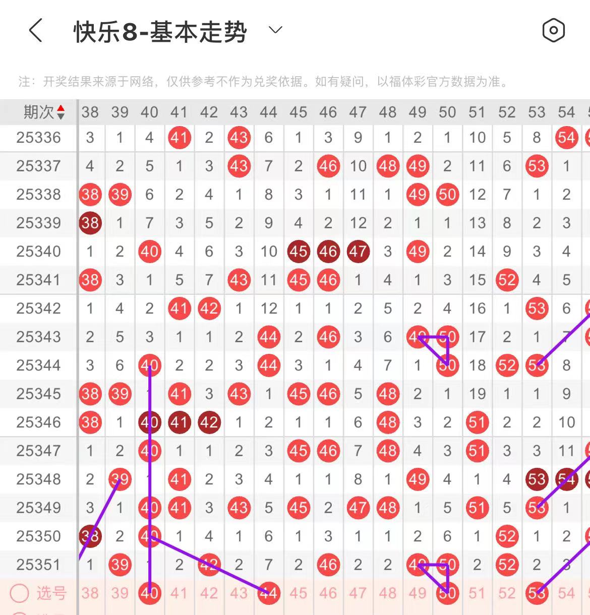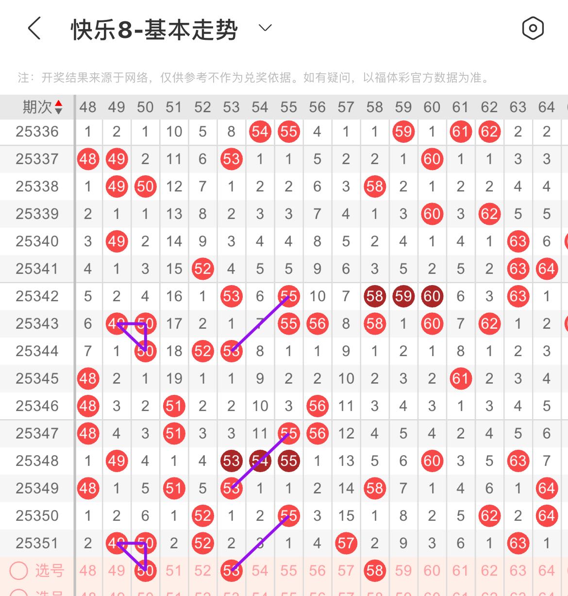 51-60区:本区间上期开出了两个号码,从号码走势图上看,该区现属于温号区,出号个数在两个号码左右。有出号走势的号码有53号,55对应53出号走势,58号,做为边号开出。