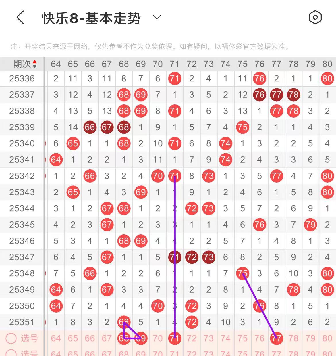71-80区:本区间上期开出了一个号码,从号码走势图上看,该区现属于温冷区,出号个数在两个号码左右。有出号走势的号码有71号,隔期相同出号走势,77号,斜连出号走势。