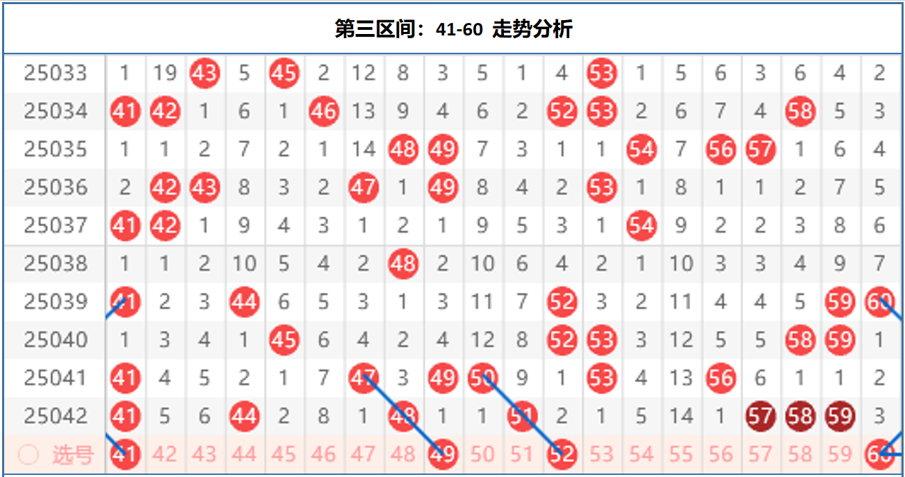 三区分析:【41-60】(走势图标注号码非小黄车大底,请谨慎参考,具体思路将在直播间分享讨论)