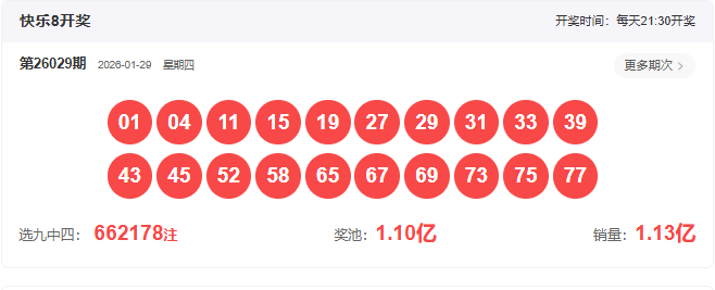 开奖号码:01 04 11 15 19 27 29 31 33 39 43 45 52 58 65 67 69 73 75 77