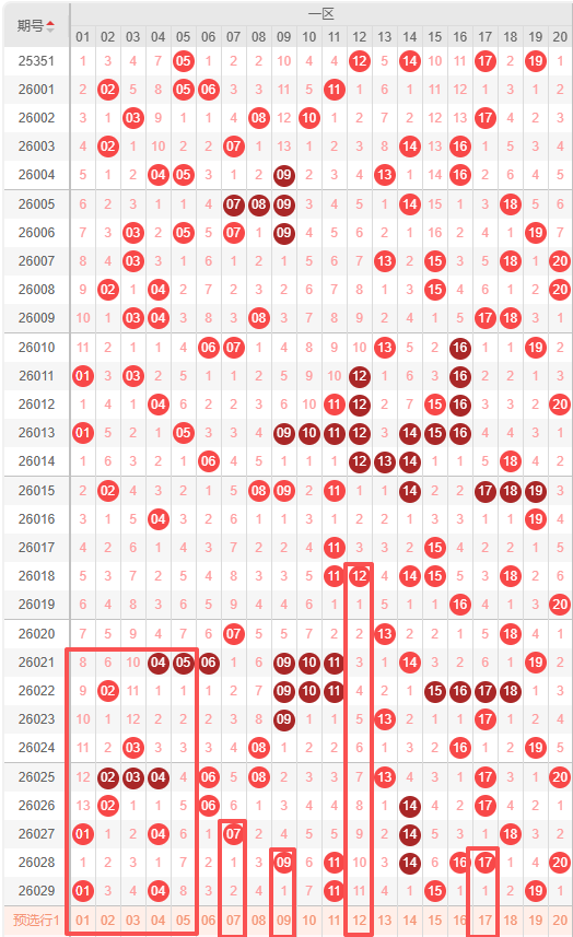 一区:最近一区10期出号情况为:3 8 8 3 4 8 4 5 6 5,总出号情况为54个,平均出号5.4个,本期一区号码推荐出号为:01 02 03 04 05 07 09 12 17。重点关注:01 04 07 12 17。