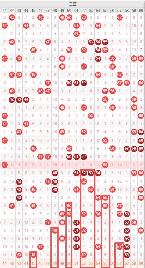 三区:最近三区10期出号情况为:4 7 4 5 6 5 5 3 5 4,总出号情况为50个,平均出号5个,本期三区号码走势推荐:45 48 50 52 53 55 57,重点关注:45 48 50 52 53 57。