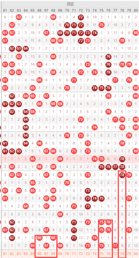 四区:最近四区10期出号情况为:7 2 5 7 4 1 5 8 5 6,总出号情况为50个,平均出号5个,本期四区号码推荐:66 67 68 75 76 78,重点关注:66 68 75 76 78。