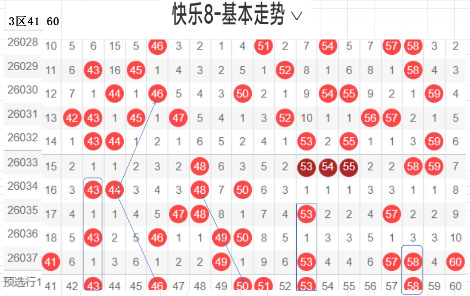 三区(41-60):遗漏5期以下有15,041 49 53 57 58 60  6,温开方式,这区码数有回暖之意,可以防一手,先定胆码走势较大者,隔期,斜三连,分边号码,可重防,间隔5以上号码可以随走势选取,例如本期大冷码,走势比较大,可以做胆,通常联动可带出,分边对称的号码,本区间也有很大走势.可关注下.隐形夹角号码.做补位形态号码.都需要观察动态走势.以上是本区间的选码方法.